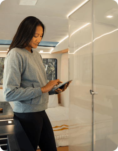 Be camp-ready in seconds, stress-free. With just one touch, watch the leveling stabilizers, stairs, awning, thermostat and lights automatically set-up camp for you.