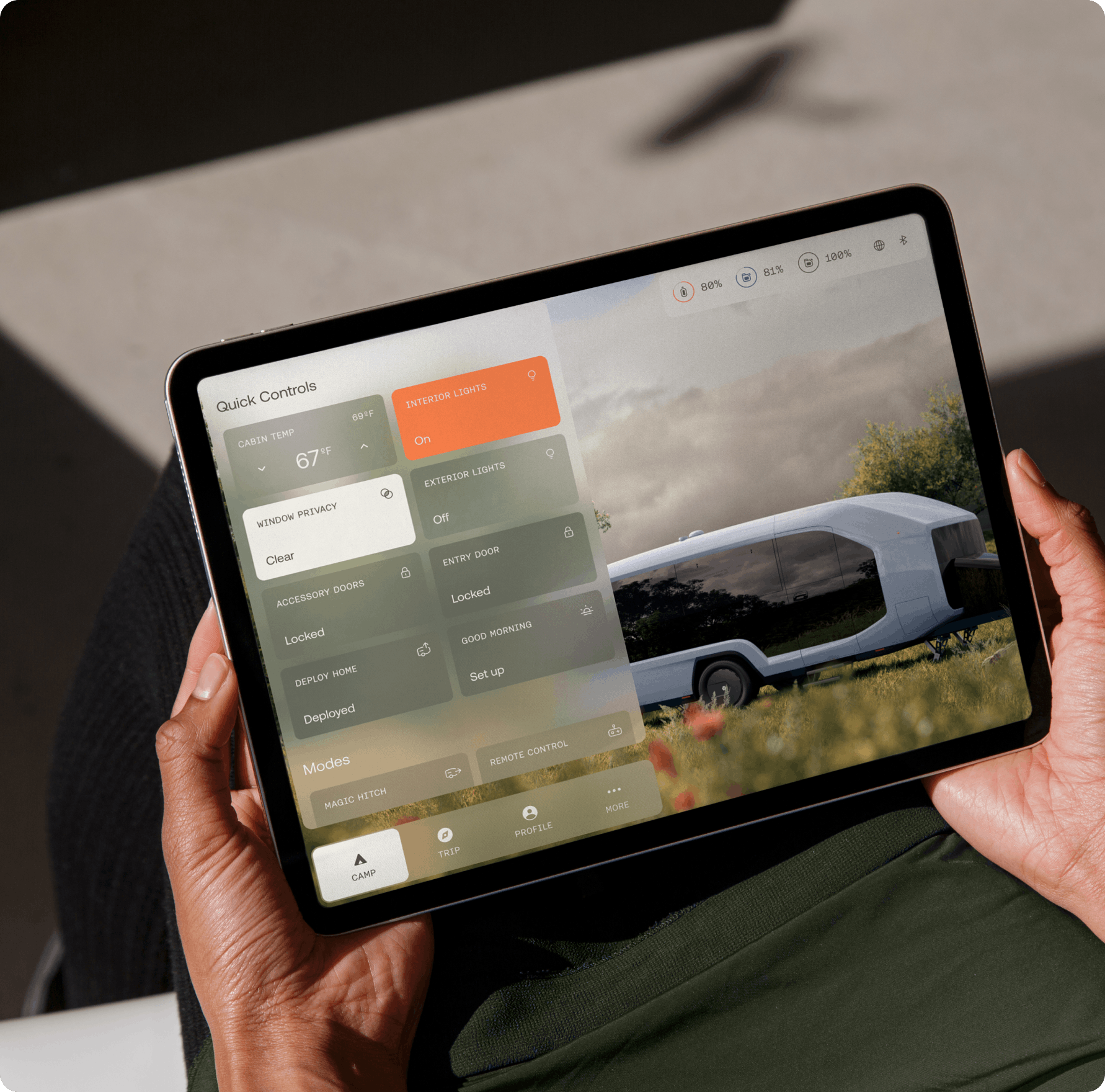 With just a touch, the Pebble Flow deploys camp by auto-leveling, unfolding the stairs, turning on the lights, setting the temperature, unlocking the door, and pitching the awning. When you’re ready to head home, retract camp just as easily.