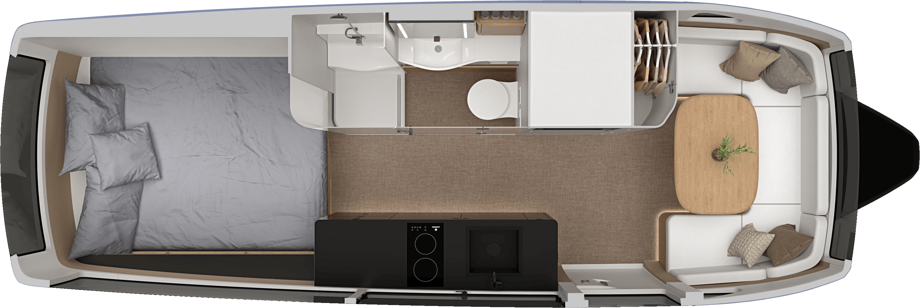 Panoramic windows give way to a 270° view. Convertible furniture, clever storage compartments, and minimalist, modern interior give you everything you need and the flexibility to make it your own
